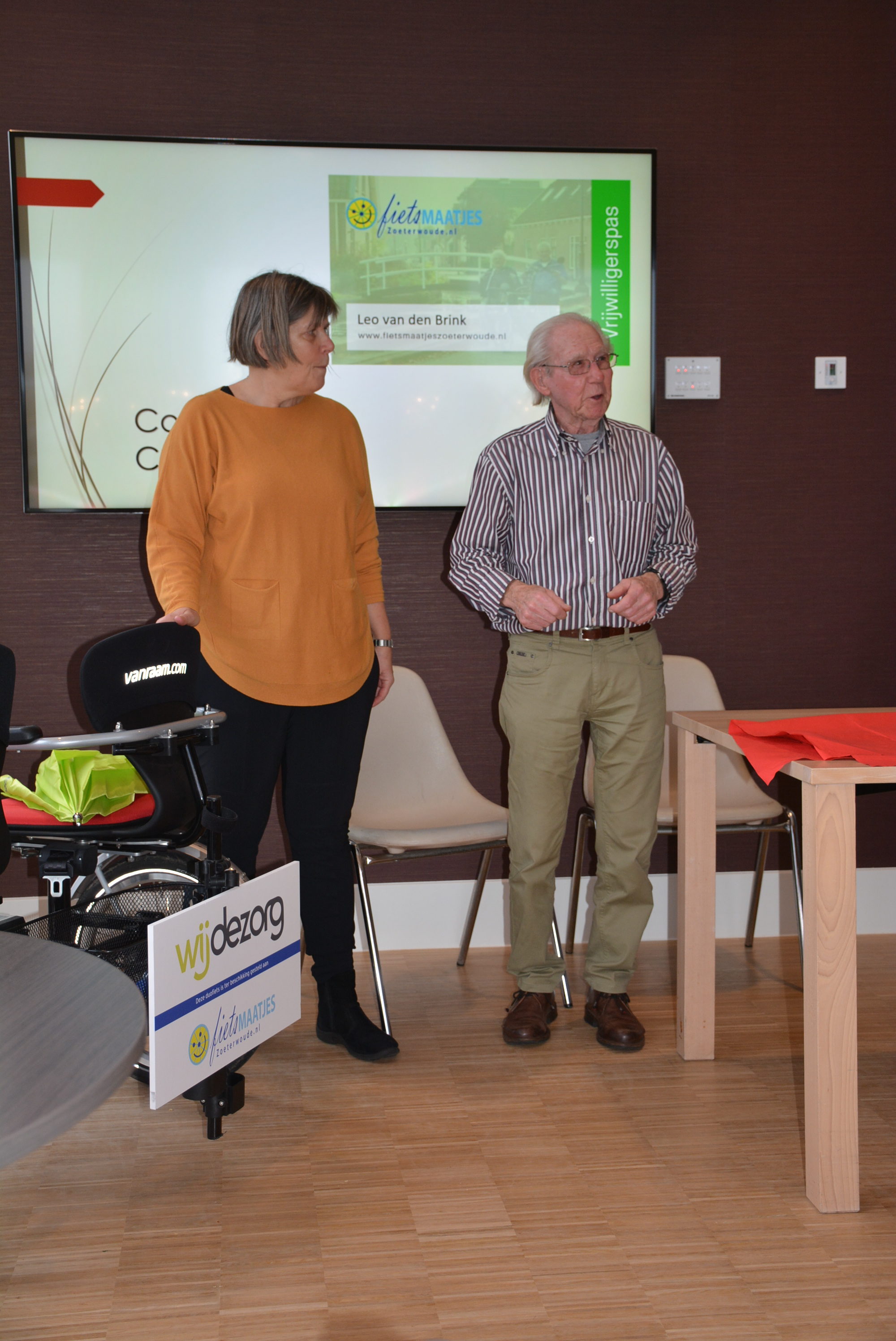 Tijdens een feestelijke bijeenkomst in zorginstelling Emmaus te Zoeterwoude is op donderdagmorgen 25 januari 2018 door coördinator Corry Rietdijk de eerste vrijwilligerspas uitgereikt aan Fietsmaatje Leo van den Brink. Daarna onthulden zij samen het sponsorbord dat prominent op de duofiets prijkt. Vanaf nu kan het fietsmaatje met een gast mooie fietstochten door Zoeterwoude en de weidse omgeving maken.